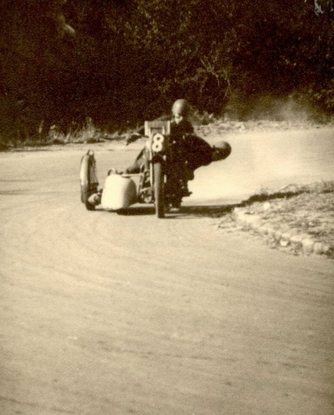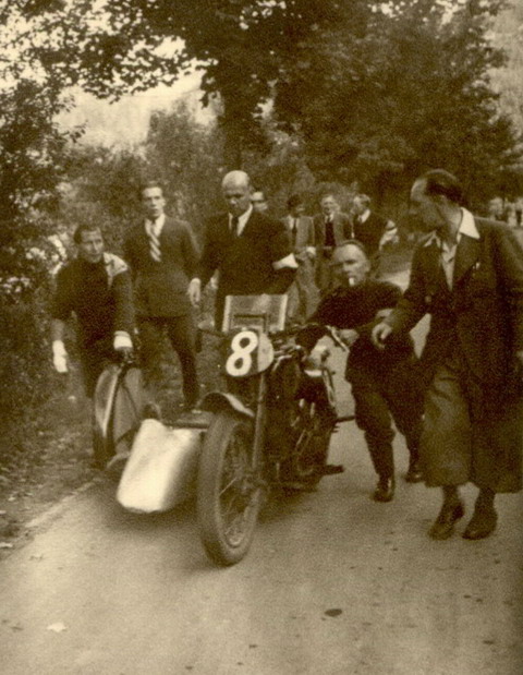 Der legendäre und famose August Wurring, Motorradfabrikant aus Ratingen-Breitscheid, mit seinem „großen“ BMW-Gespann ( im Boot : Köster ) . Sieger 1948. Im Fahrgestell des Gespanns ein sogenannter „Wehrmachtsmotor“
