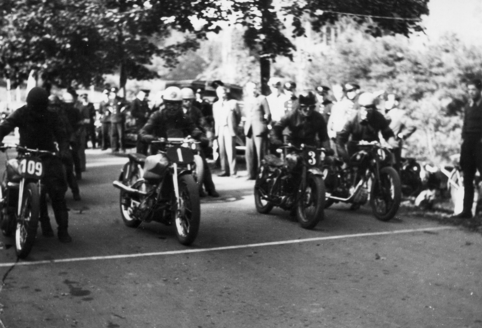 Starterreihe zum ersten Burgringrennen 1948 in der 250er-Klasse. Nr 109 ist der spätere Sieger Eberhardt, Nr 1 Rennfahrer Jungbluth, der eine Runde führte und dann ausfiel. Die Nr. 9 ist eine 250er NSU OSL